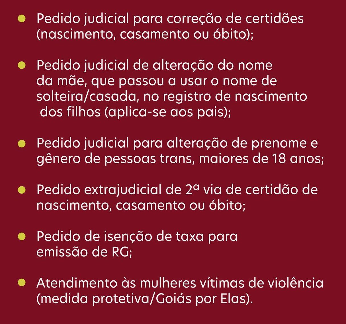 A Defensoria ainda oferecerá pedidos judiciais para correção de certidões de nascimento, casamento ou óbito, alteração do nome da mãe nos registros dos filhos, alteração de prenome e gênero de pessoas trans maiores de 18 anos, além de pedidos extrajudiciais de segunda via de certidões.