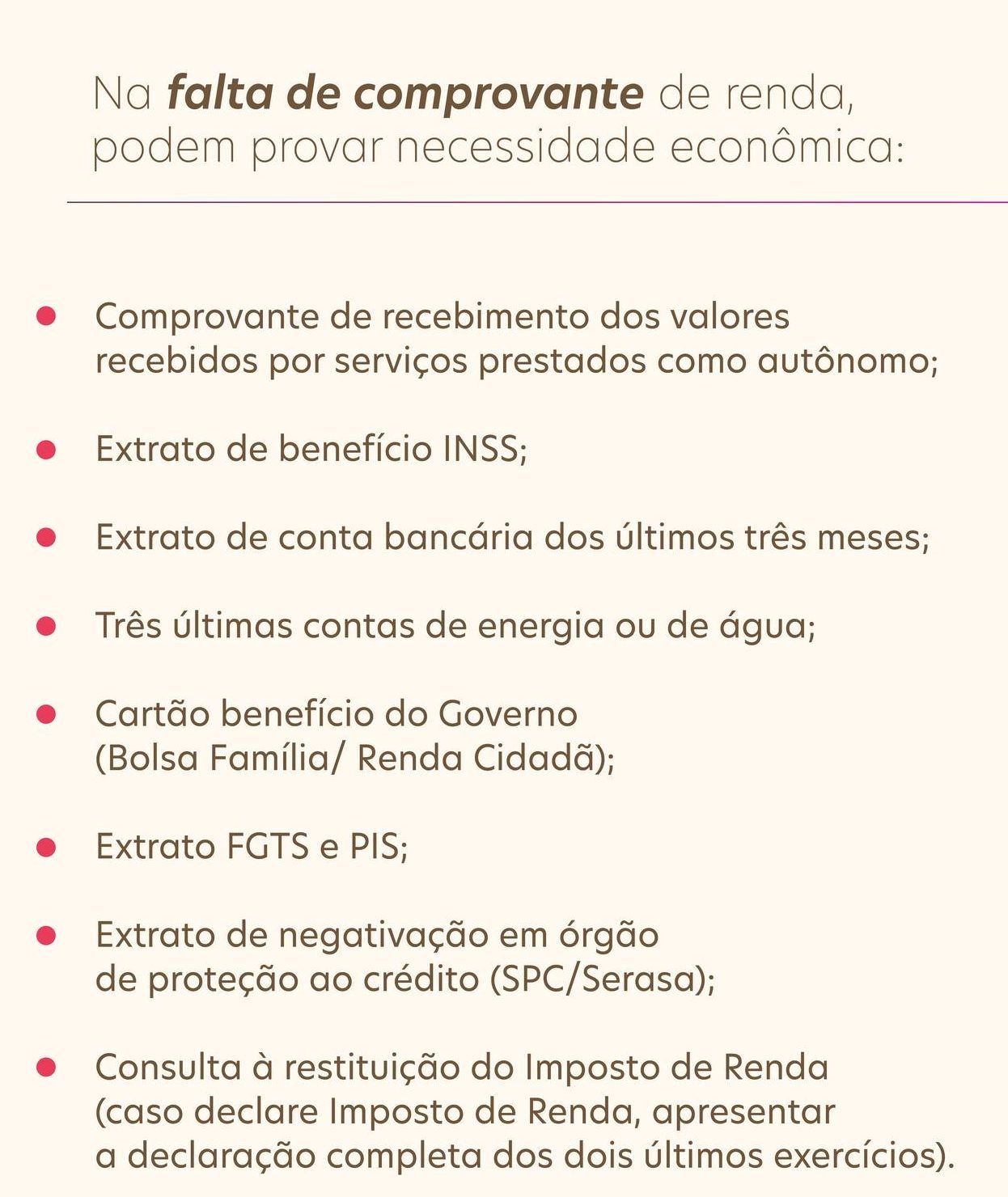 Caso não haja comprovante de renda formal, a necessidade econômica pode ser comprovada por outros meios, como comprovantes de recebimento de serviços prestados como autônomo, extratos de benefícios do INSS e extratos bancários dos últimos três meses.