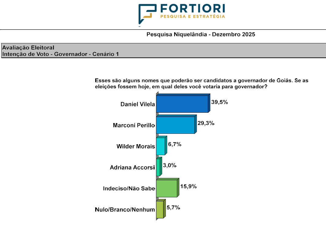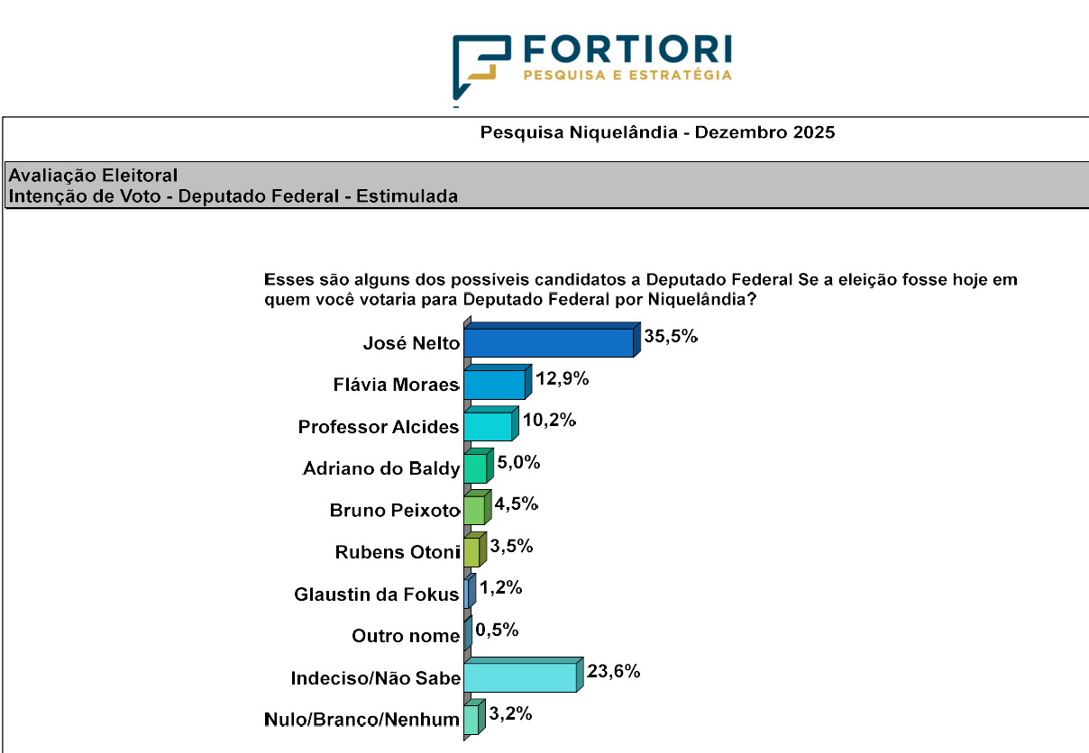 ELEIÇÕES 2026 – Além da avaliação da gestão do prefeito Eduardo Moreira em Niquelândia, a “Fortiori, Pesquisa e Estratégia” também quis saber, em dezembro passado, as convenções dos congressistas da cidade para as cargas que se beneficiam em disputa neste ano de 2026 no Estado de Goiás, a saber: