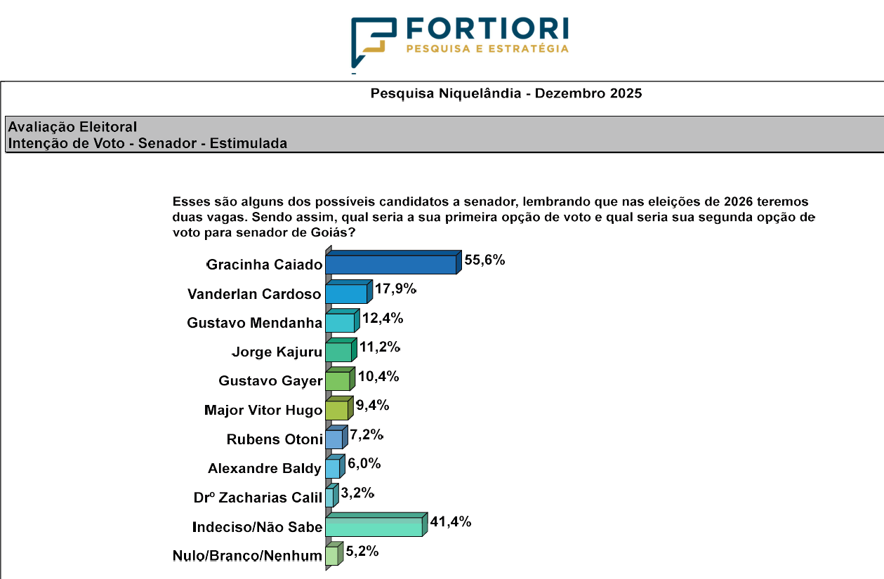 SENADOR – Para a eleição ao Senado Federal – que, em 2026, terá duas vagas em disputa – a Fortiori Pesquisa e Estratégia apresentou, aos niquelandenses pesquisados, várias opções de nomes de possíveis postulantes.