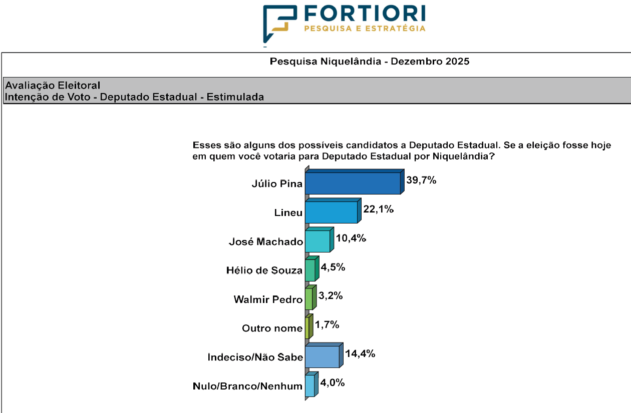 DEPUTADO ESTADUAL – Alicerçado pelo trabalho que desempenhou em Niquelândia em seus dois mandatos eleitos como deputado estadual, Júlio Pina (Solidariedade) apareceu em 1º lugar no levantamento da Fortiori Pesquisas, com 39,7%.